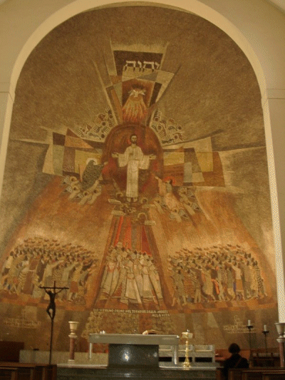 L'interno č composto da tre navate. Questa chiesa ha pochi dipinti, ma, entrando, si nota subito il grande mosaico con Gesų, situato nell'abside dietro l'altare, nella navata centrale.
